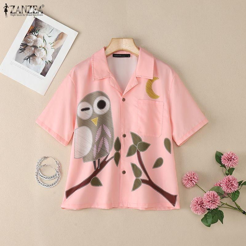 ZANZEA Women Casual Turn Down Collar Loose Short Sleeve Print Blouse