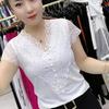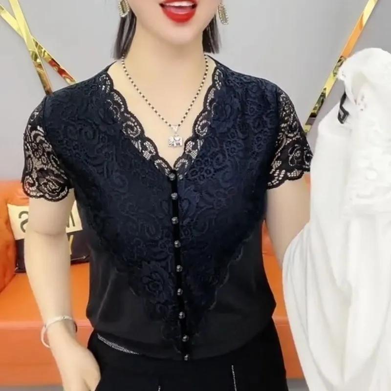 Women's Summer Short Sleeve Elegant V-Neck Lace Patchwork Clothing Design Pearl Button T-shirt