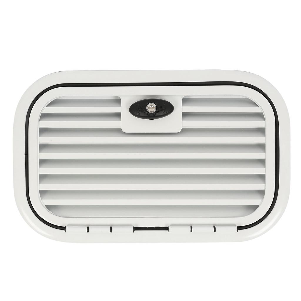 Application: Ventilated grille storage compartment door with safety lock, grille ventilation design for warehouse door, suitable for ventilation requirements such as RV shower room, RV air conditioner refrigerator air outlet, cookware storage, etc.; the door can be opened at 0 180 degrees, suitable for modification and installation of RV, towing car camping car, teardrop trailer, etc.