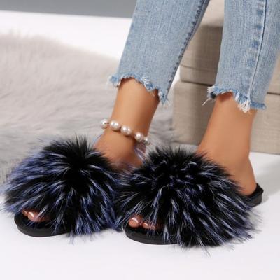 Women's Faux Fox Fur Slide Slippers, Fashionable Plush Indoor/Outdoor Non-Slip Flats