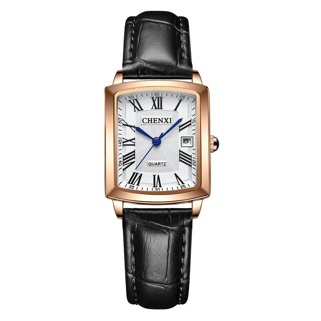 Women's Leather Strap Watch with Roman Alphabet, Analog Display, Calendar, 3ATM Water Resistance, Square Design, Popular Antique Style, Black,