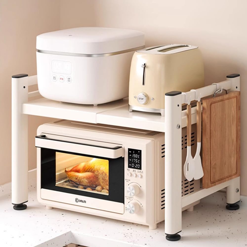 [Space-Saving & Two-Level Height Adjustment] This rack is suitable for small appliances like microwaves and ovens, and offers ample storage for seasonings and kitchen utensils, making full use of dead space in your kitchen. The shelf height can be adjusted to 31 cm or 40 cm to accommodate the size of your appliances. It also comes with six hooks on the side for storing various small items, allowing you to make effective use of space.