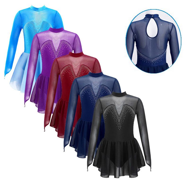 Sparkly Rhinestone Skating Dress for Girls: Hollow Back Mesh Splice Long Sleeve Ballet Leotard, Round Collar Dance Gymnastics Performance Outfit