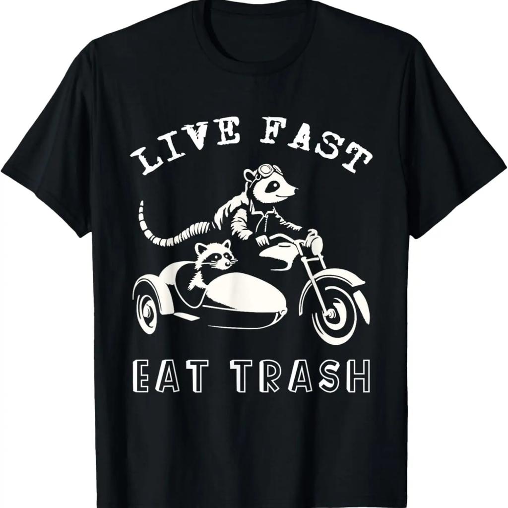 Racoon Possum Riding Motorcycle Live Fast Eat Trash Funny T-Shirt