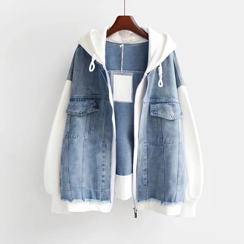 Women's Oversized Loose-Fit Denim Jacket with Hood and Open Front Baseball-Style Sweater
