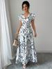 Spring and Summer New Printed Lotus Leaf Edge V-neck Sexy Slim and Thin Long Dress Dress