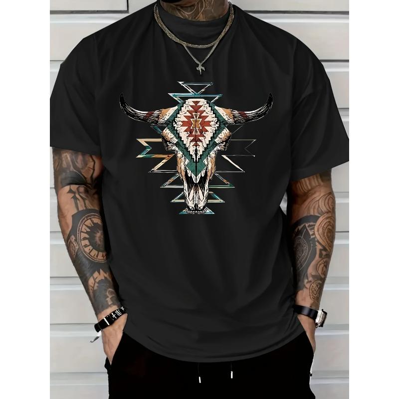 European Sizes Men's Black Short-Sleeve T-Shirt with Native American-Inspired Bull Skull Print and Geometric Patterns