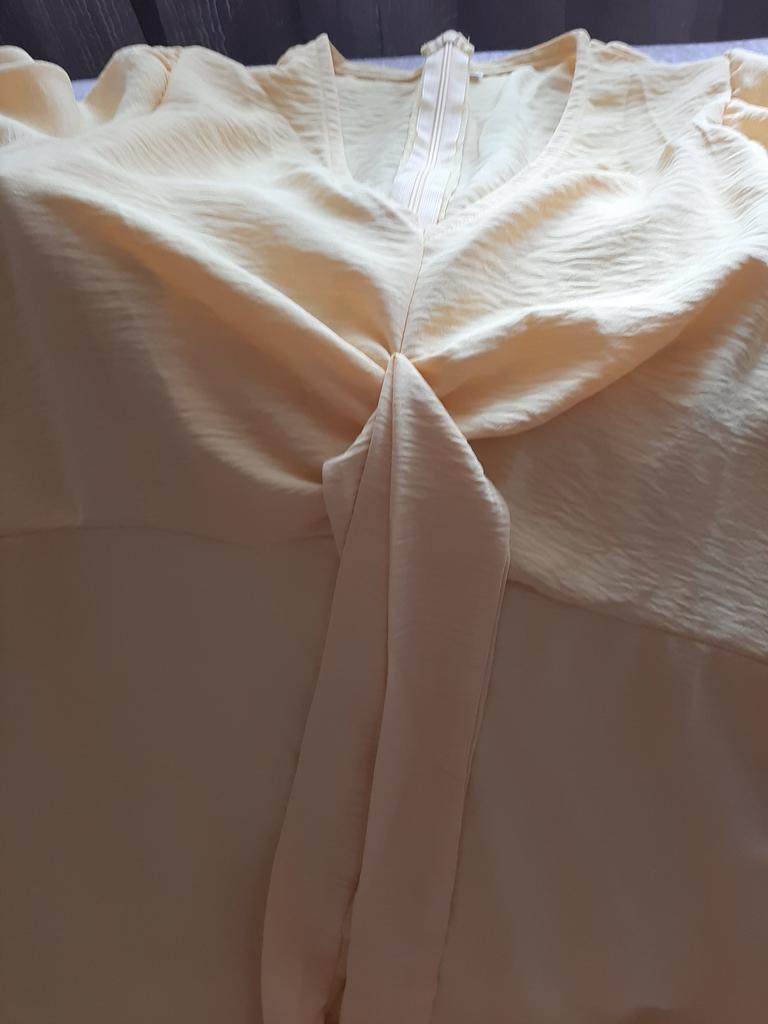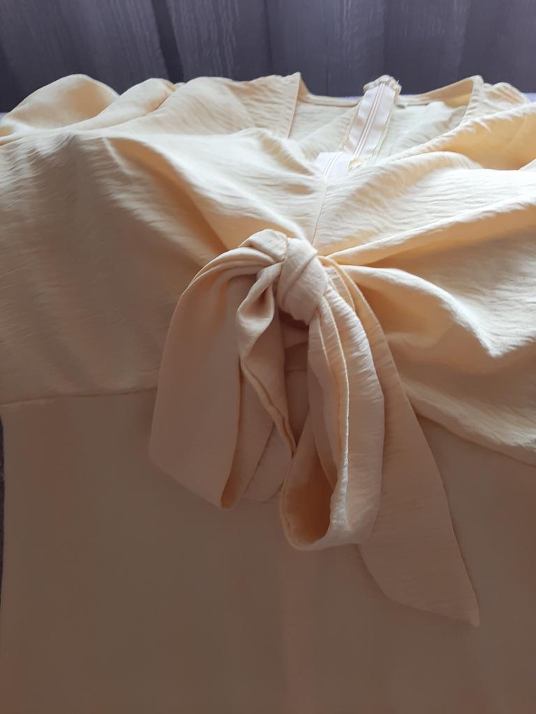 The dress is made of crinkled fabric, which does not match the photo on the product card. In the photo, it looks like cotton. The dress is see-through.