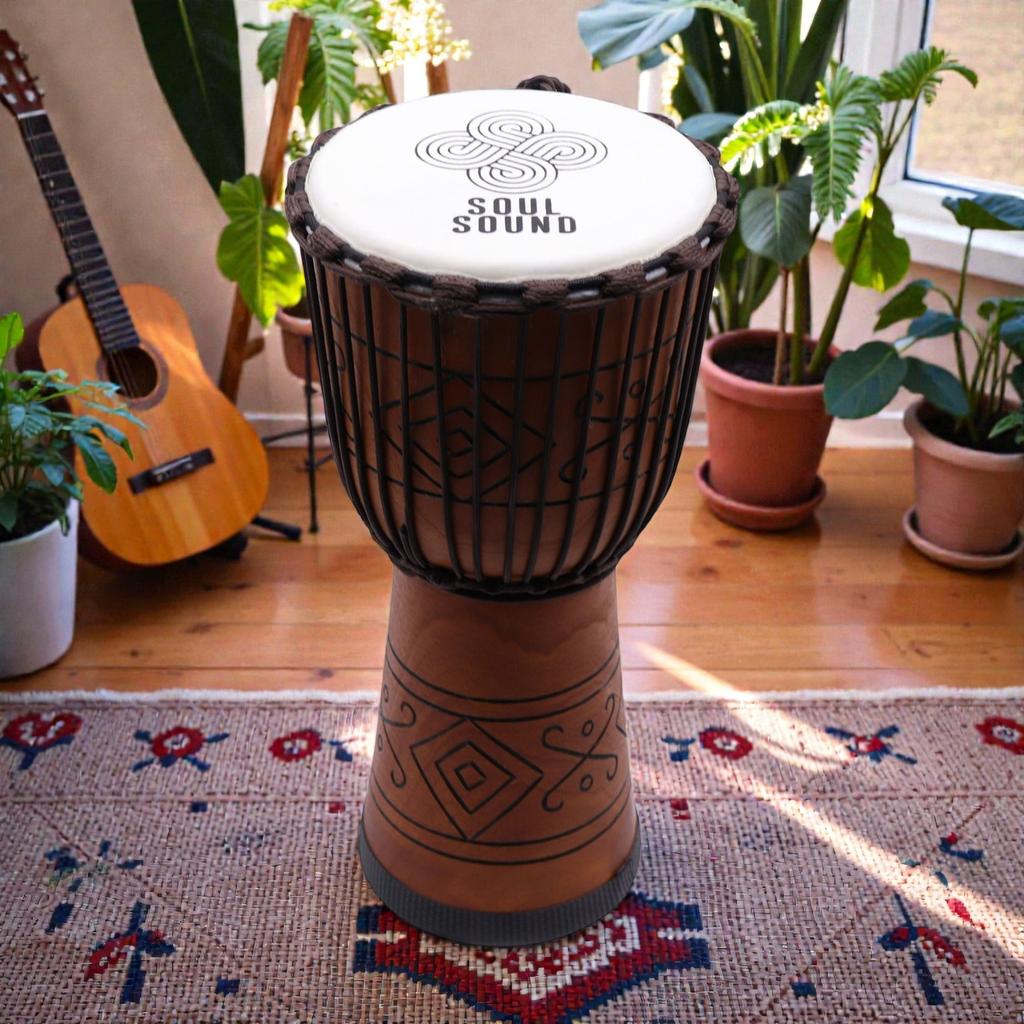 Soul Sound drums carry a hand-carved geometric pattern on the body, visually distinct from the flowing wave design on Freedom Rhythm models. The geometric motif reflects the drum's character — structured, grounded, deliberate — just as the wave pattern on the Freedom Rhythm reflects movement and energy. This visual difference means the two profiles are immediately distinguishable on a shelf or in a display, even before being played.