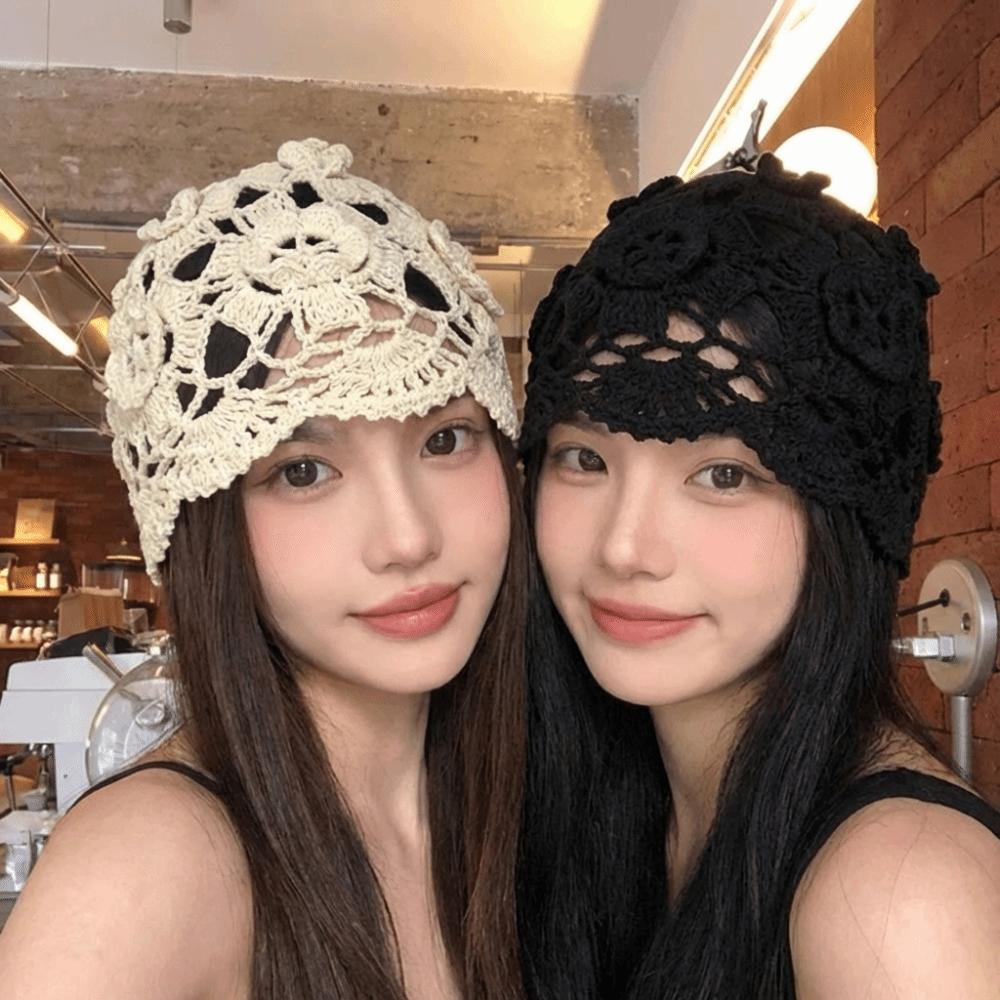 Handmade Hollowed Out Beanie Cap Thin Woven Cap Cute Crochet Flower Knitted Hat Outdoor