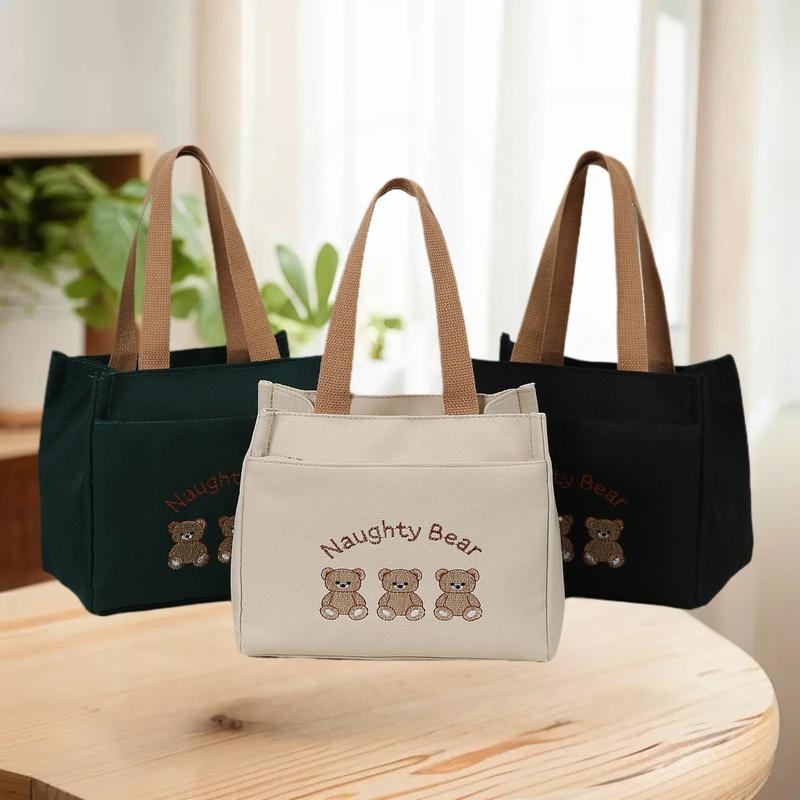 {MAX-66} Cute Small Bear Printed Canvas Versatile Handbag Commuter Office Worker Lunch Bento Tote Bag