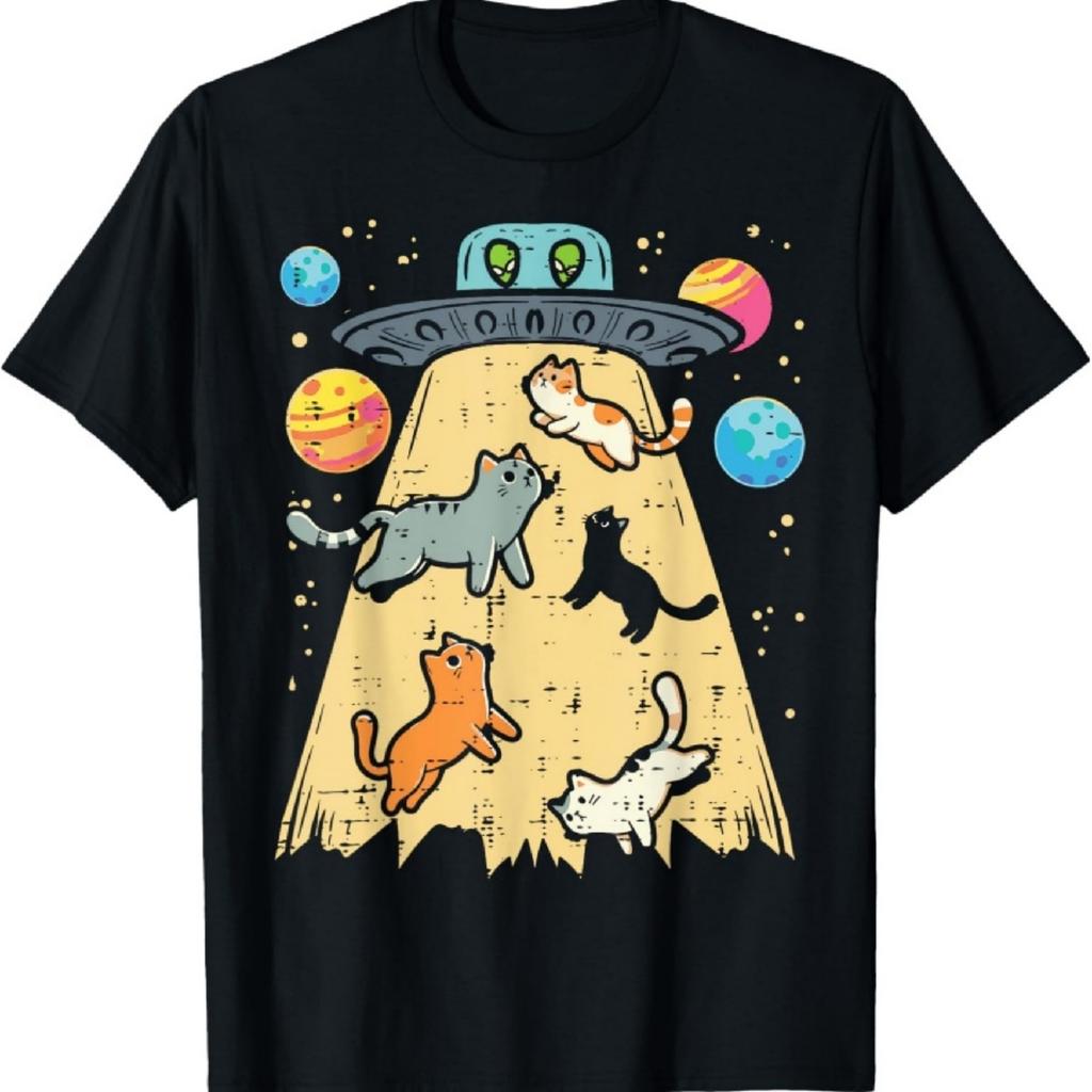 Alien Abduction Cats UFO Flying Saucer Space Women Girls Kid T-Shirt