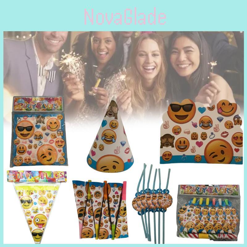 This party decor set features emoji-themed disposable tableware designed to brighten any celebration.The set also offers yellow utensils10 knives, forks, spoons, and strawsideal for festive events.Made from durable plastic and paper, these items support easy cleanup and vibrant presentation.Suitable for holidays like Christmas, Valentine's Day, or children's parties, they enhance mood and atmosphere.Wipe tablecloths with a damp cloth after use for maintenance.