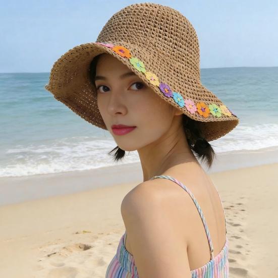 Featuring large eaves, it offers full-face sun protection by effectively blocking harmful ultraviolet rays. The hat is beautifully decorated with colorful flowers, enhancing your appearance while creating a slimming effect for your face.