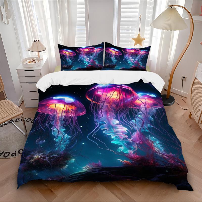 3pcs Colorful Jellyfish Bedding Set - Includes One Quilt Cover and Two Pillowcases (No Core) - Anime Cartoon Design for Bedroom Decorations.