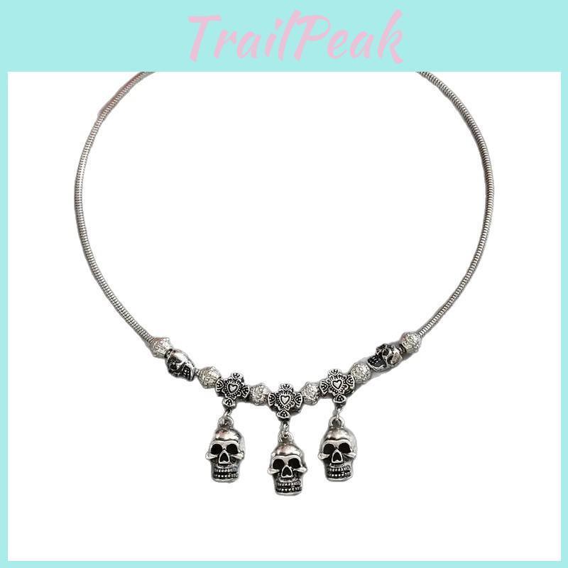 This dark-style chain necklace features a geometric alloy design with a skeleton head pendant and tassel accents, creating a bold costume accessory. Crafted from durable alloy with electroplating. Ideal for Halloween parties or gothic-themed events, it enhances any costume look. Easy to maintain, wipe clean with a damp cloth for long-lasting wear.