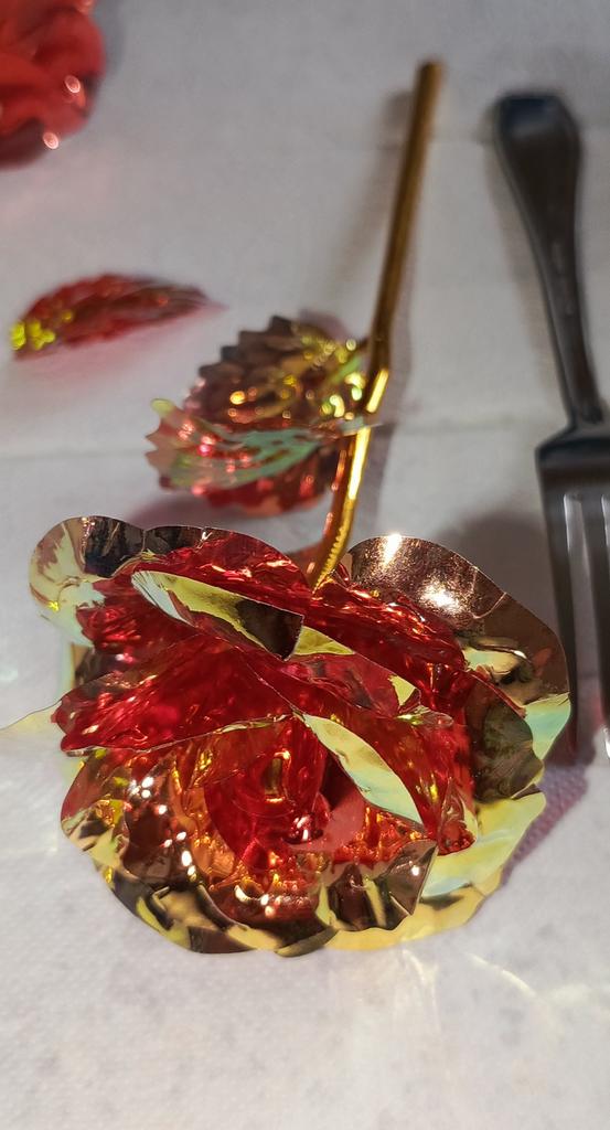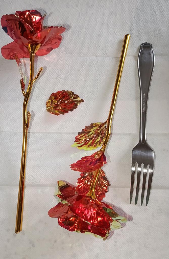 Виделку залишили на фото як орієнтир по розміру. Одна троянда 🌹 ціла, на другій відлетіли листя, одне можна приклеїти, а одного взагалі немає. За а 0.10 євро норм, тільки жалкую що взяла червоні. Прозорі топ.